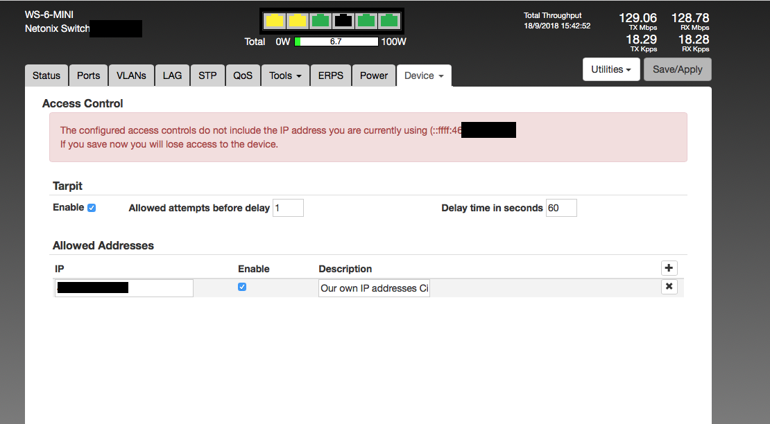 You said your error message was that you would lose control of the switch which is because the IP your at does not fall within the specified allowed IP's in your list....correct?