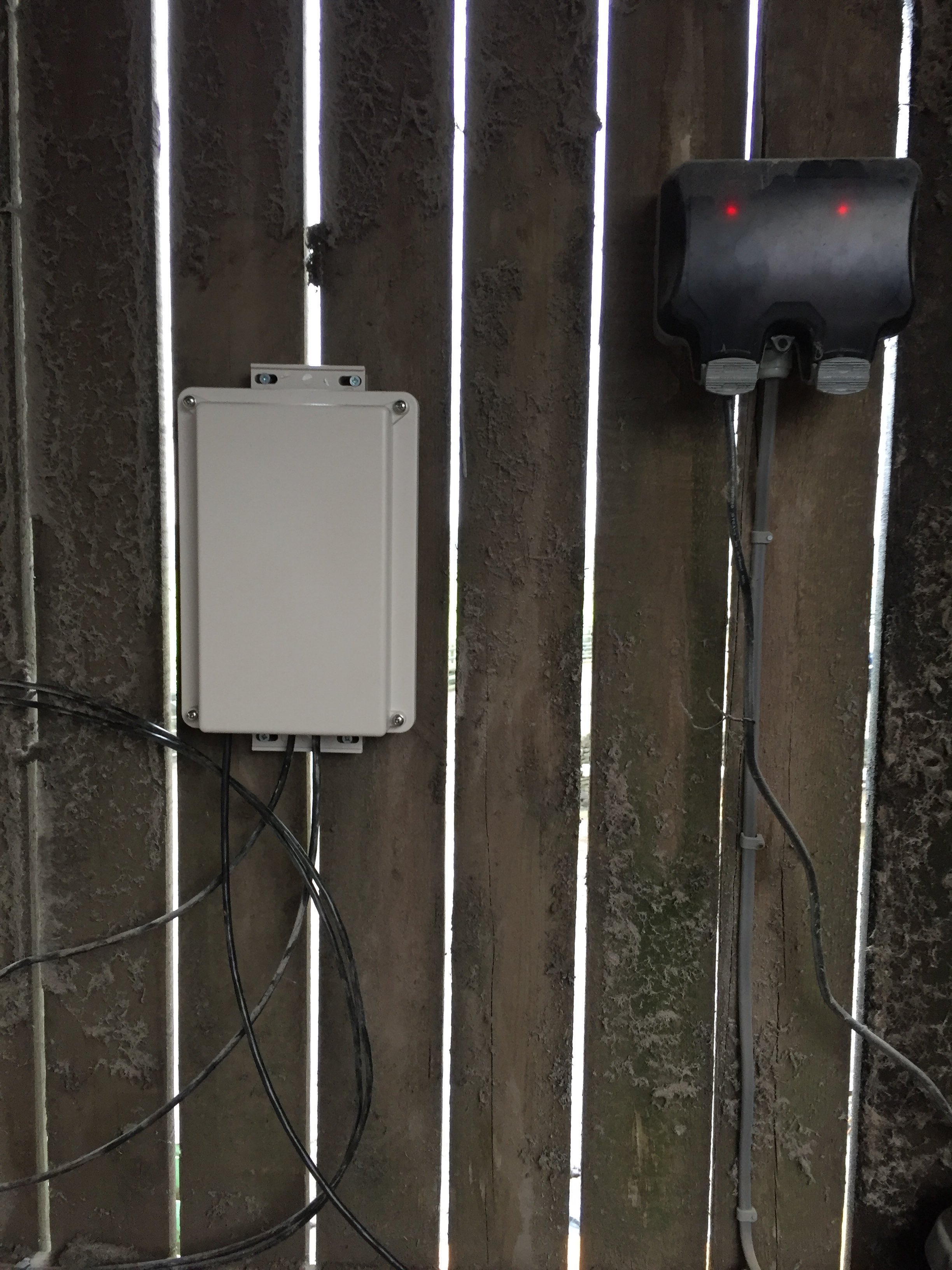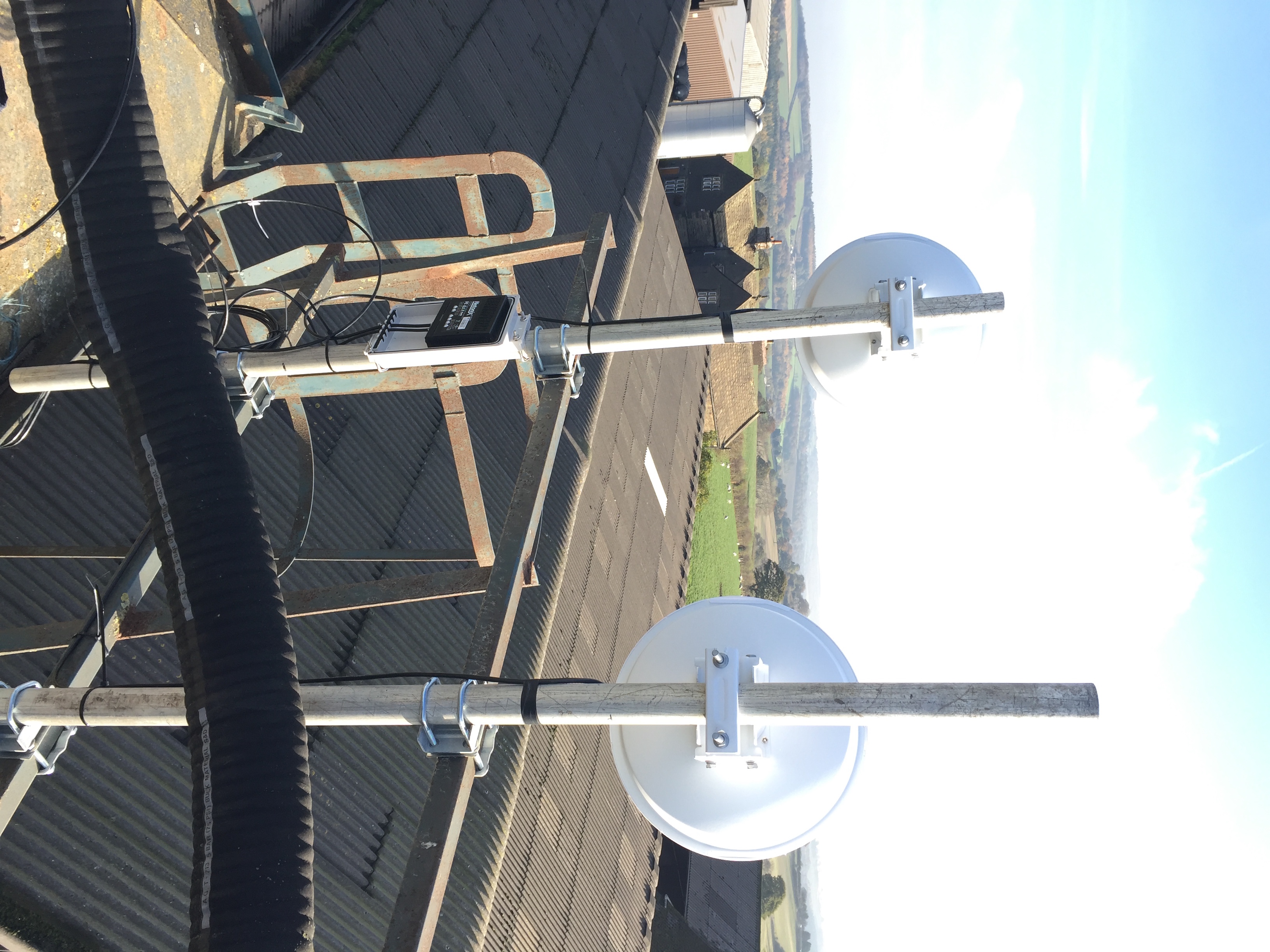 This is a farm based Micro-POP. PowerBeam 5AC-400-ISO in, PowerBeam 5AC-400-ISO out and a NanoStation for the local buildings. WS-6-Mini is powered via Ubnt POE-50-60W, I am close to power here but at other similar sites I have to travel some distance for power and it's nice to have just one spare power supply type rather than mix in the barrel power where it would work. I always think the WS-6 looks super tidy in the designated enclosure, and it's very well protected.