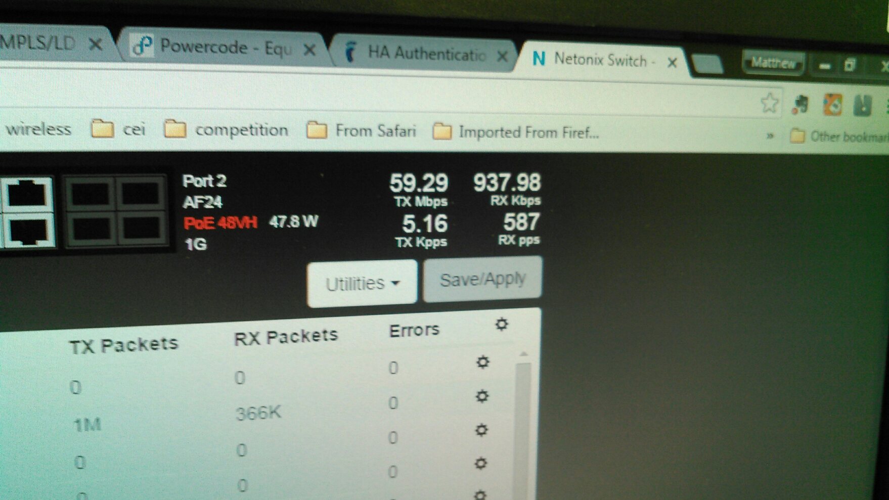 I am noticing a significant discrepancy in the throughput values of the port I am testing across as compared to the Tik's. As you can see in the images, the Tik is indicating on eth3 that it is moving well over 100Mbps through the interface. However, the Netonix switch port (AF24 acting as midspan) is displaying throughput levels of roughly 1/3rd. The test is getting through and a mirrored level of throughput is arriving at the other end so its not an issue where the switch is causing adverse effects on the traffic.