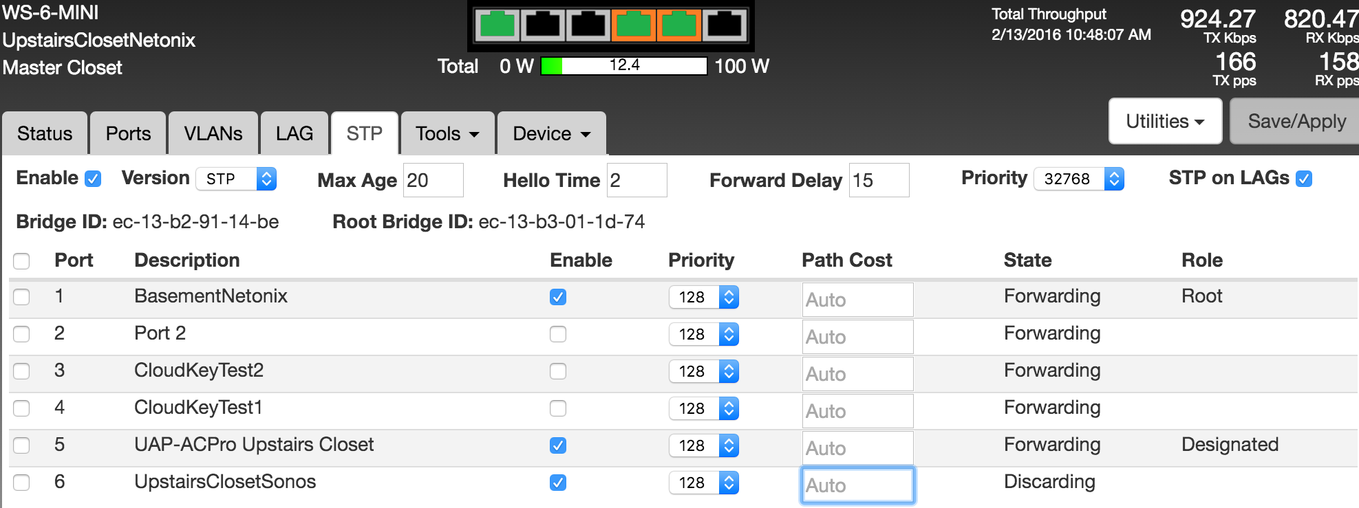 However, the guidance on configuring this from Sonos is fairly limited and references a Cisco switch. My attempts to replicate the recommended configuration settings on the Netonix switches have not been met with success. For example, when trying to enter the recommended value of 10 in the path cost section for the ports connected to wired Sonos players of the Netonix web interface, the interface doesn't let me and won't accept a value less than 16 (even though the hovering tooltip indicates a value all the way down to 1 is acceptable). I also don't see anything related to some of the other settings like BPDU handling and Path Cost default values. I've attached a screenshot of the STP settings on one of the Minis. All switches are running the latest stable firmware and the basement switch is configured as the root.