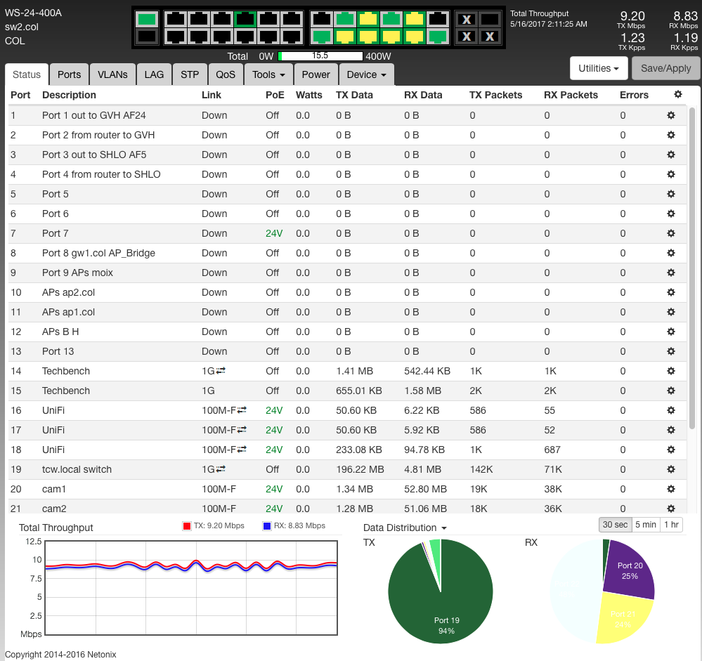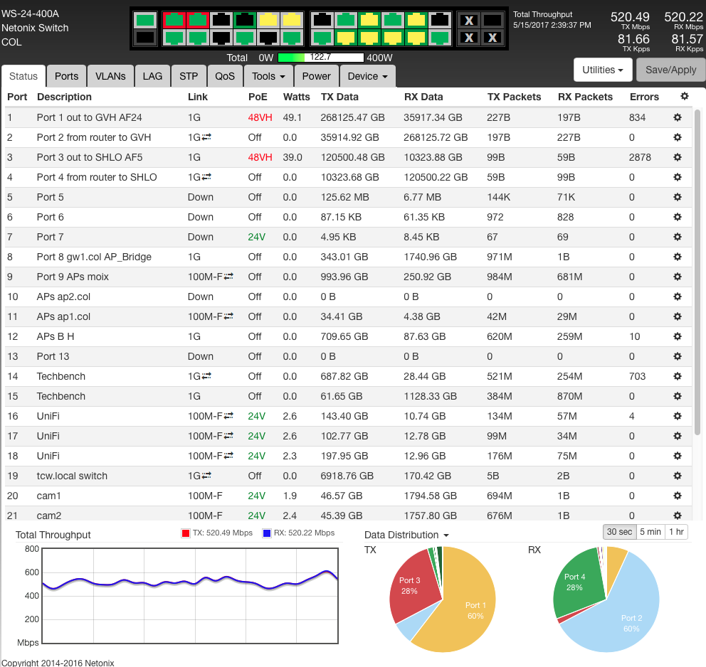 Port 5 is WS-12-250-DC to which I am going to attempt to move the backhauls and APs. Port 13-24 are in building wifi and cameras. I don't care if they drop during testing.