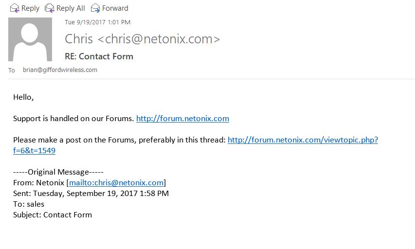 bhesterberg wrote:Since I can't just email Netonix and get support, I have to post it in here. Seems pretty shitty, but what choice do I have...
