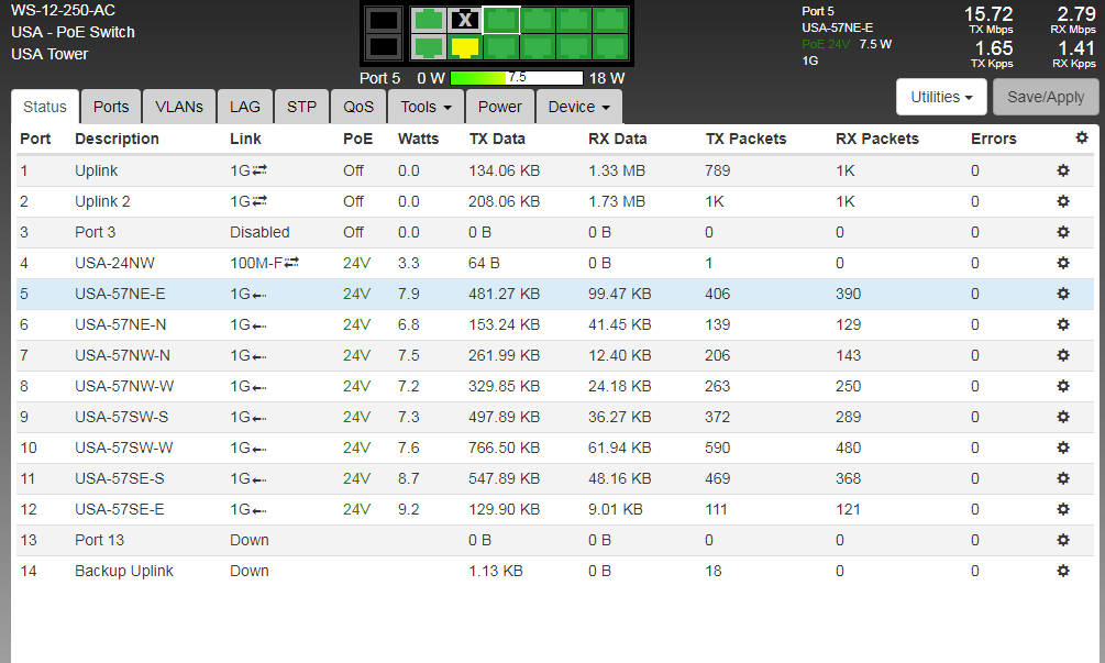 So from what I can see you have 8 airMAX AC radios which can use peak 18+/- watts each and what looks like an airMAX n radio which can peak at 15+/- watts,