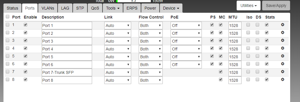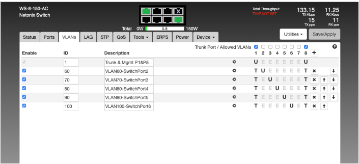 We are using multiple Netonix WS-8-150-DC in a heavily wooded area hardwired by fiber and low voltage to waterproof boxes. We want to separate the interfaces so that we can run OSPF from one CCR1009 Mikrotik router to another but haven't been able to do so with only one fiber and clients along the way. I thought that we could set up VLAN interfaces along the way and trunk from one switch to another along the way. But right now in my bench testing I can't see past the second switch and the second switch won't pass any traffic back to the 1st router. I feel that I am missing something basic and would appreciate any feedback. We are running 1.5.0 firmware. Attached is a screen shot of the VLAN tab on the switch and the interfaces on the Mikrotik
