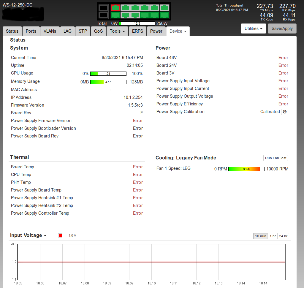 After the power outage on 8/19, the AF11 went down twice on 8/20 and again on 8/21. I only logged into the switch after the 3rd outage which is when I noticed the sensor issues, but also that the switch rebooted when the AF11 last went down. This led me to believe that the switch was likely bad and probably not the AF11 after all.