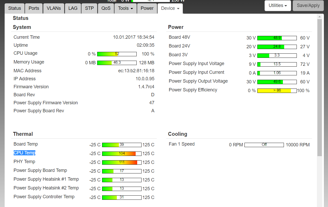 So while the other WS-12-250-AC switch has the highes CPU/PHY temp from 44 to 74°C, the new one has ~ +20°C more - from 70 to 95°C. As I read above, it seems that in the newer switch has different CPU/PHY sensors than before and now I have these with +- 30% accurancy? I was thinking about bad mounting of heat sink inside, or maybe missing?
