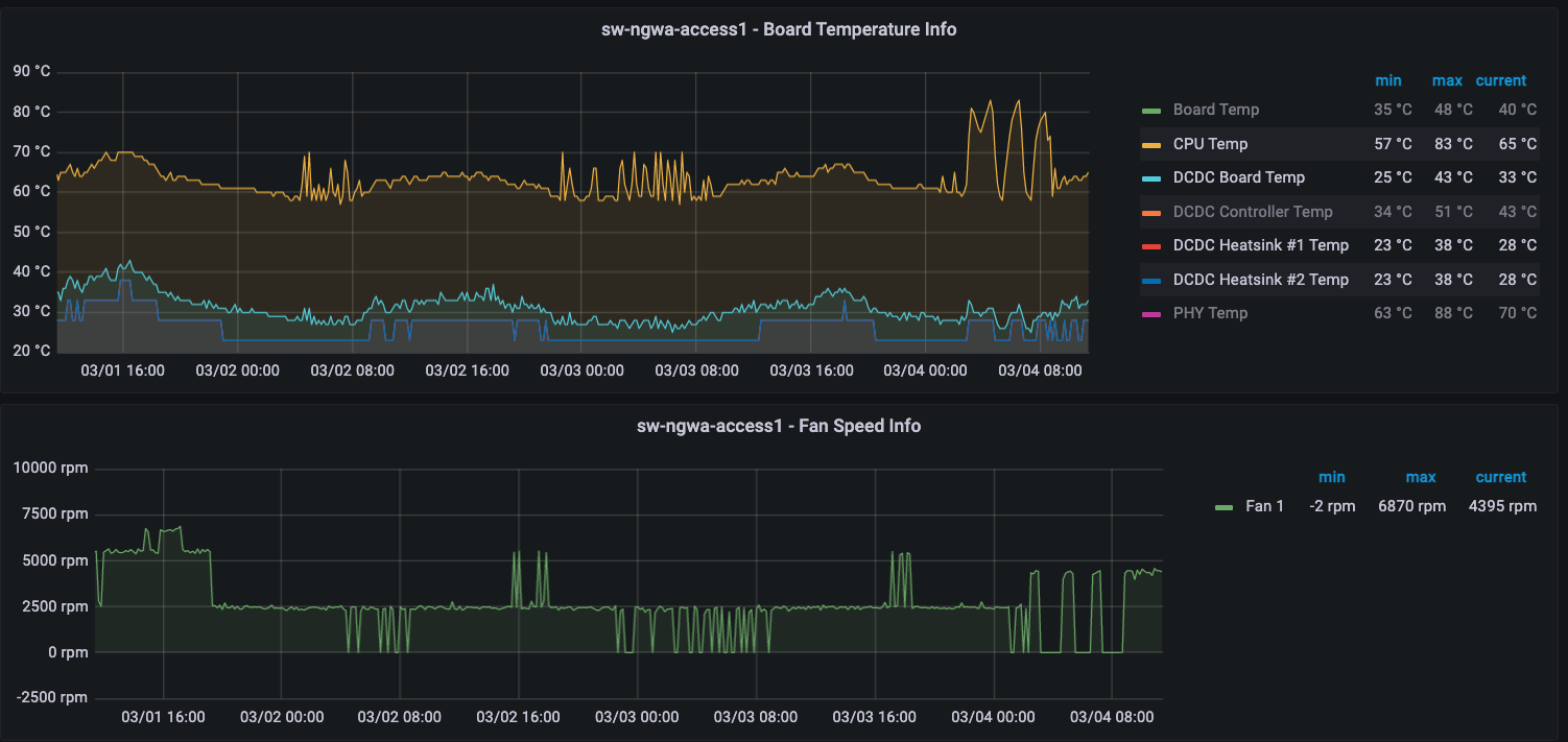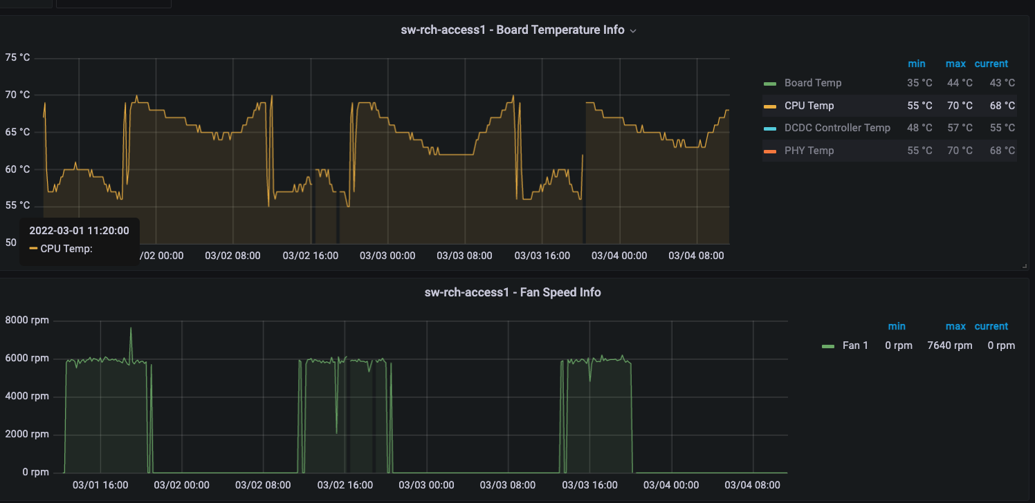 For the two switches that we have past data and new data, they were both running 1.5.0 and 1.5.2. Now I'm not sure whether firmware changes up to now has specifically made changes to how the fans work, but this pattern doesn't seem quite right. Constant thermal expansions on those CPUs will not be good in the long run