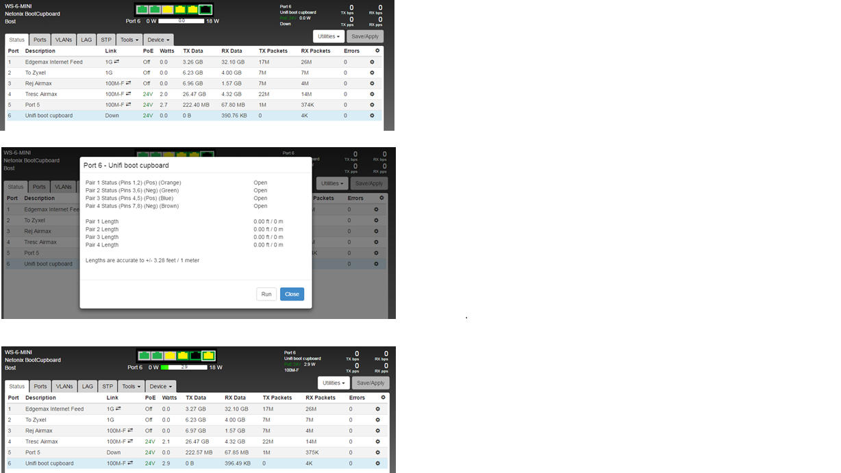 -Unifi moved from Port 5 to 6. Can no longer ping. Powers up okay, but is 'isolated'. Green 24V, 2.9W Tx data 0B Rx data 300kB