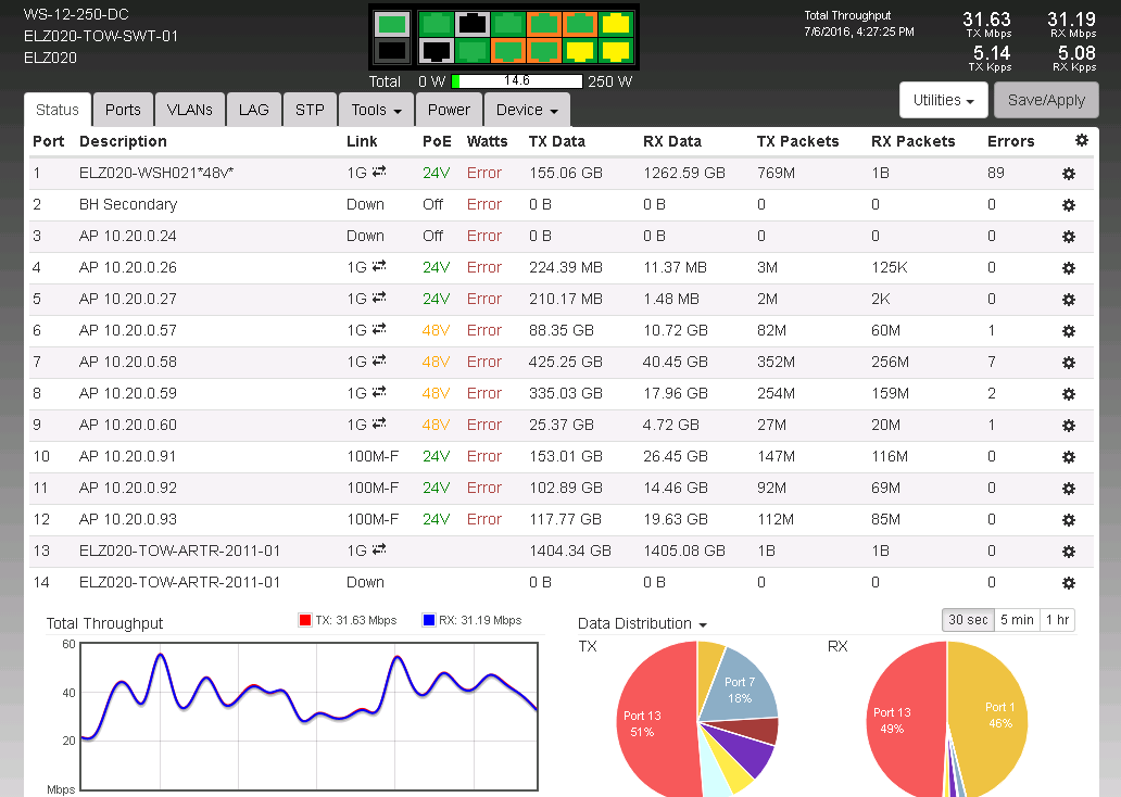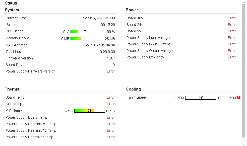 We have a WS-12-250-DC running 1.3.7 that just started 'freaking' out (see attached logs/screenshots). Several 'i2c' errors and other errors as well (see logs). In this state, the switch was still forwarding packets, but interface errors started to increment (at least on the UI) once this started happening. We typically see 0 errors on all interfaces.