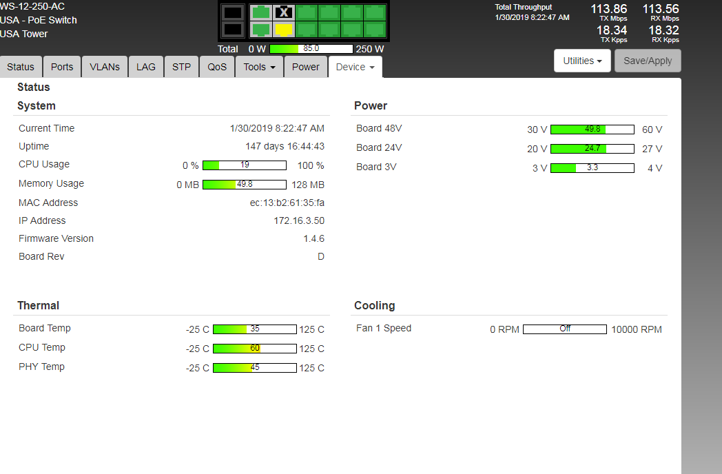 Ports 3-12 were not rebooting POE but the ethernet was flapping up and down with these temps. Going from down, to 100 Meg, to down, back up to 1G. They would keep doing this until I turned off POE on all the ports 3-12 then turned them on one-by-one until they were all back at 1G. It started happening again so I turned off Port 11 and left it off which helped stabilize the port flapping but it still happened 3 times overnight again, which is much better than every few minutes though.