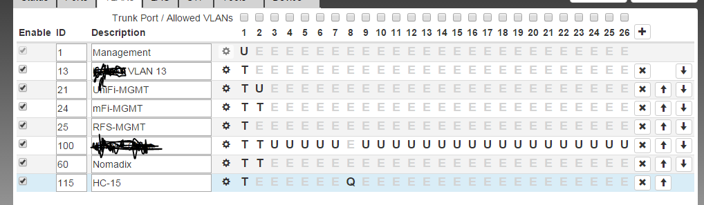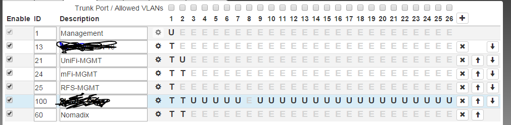 - Port 14: Management vlan (1) untagged, other vlans tagged.