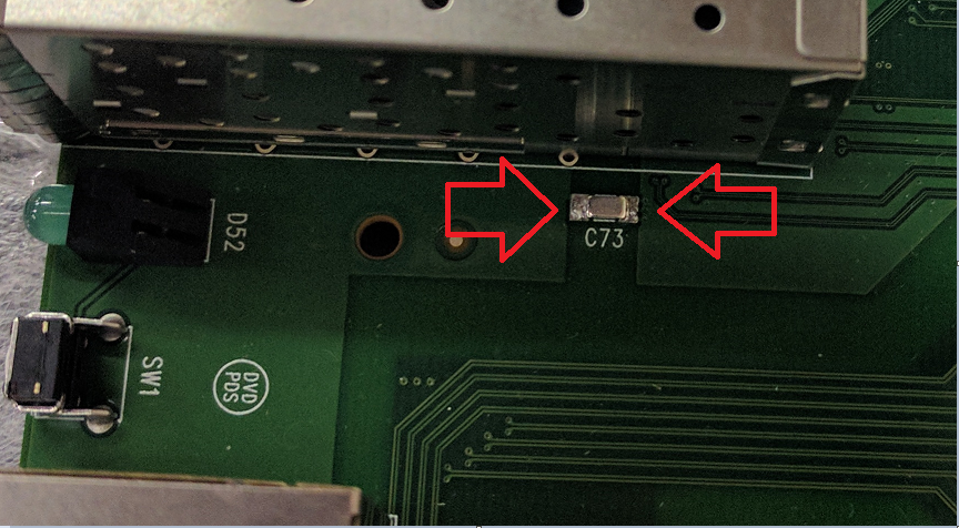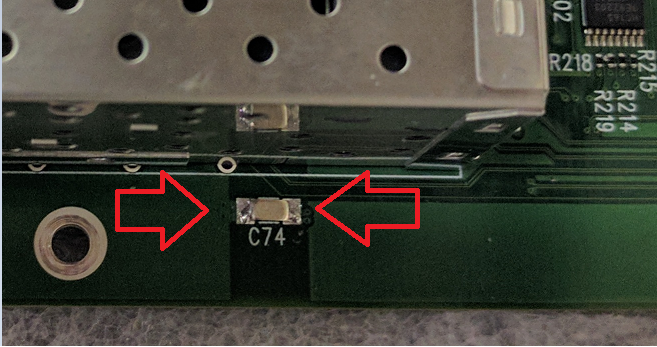 The second point of modification is to the right of the 4-gang SFP stack on the right hand side of the board with the ports facing you. It is near the edge of the board. The component to replace is marked C74.