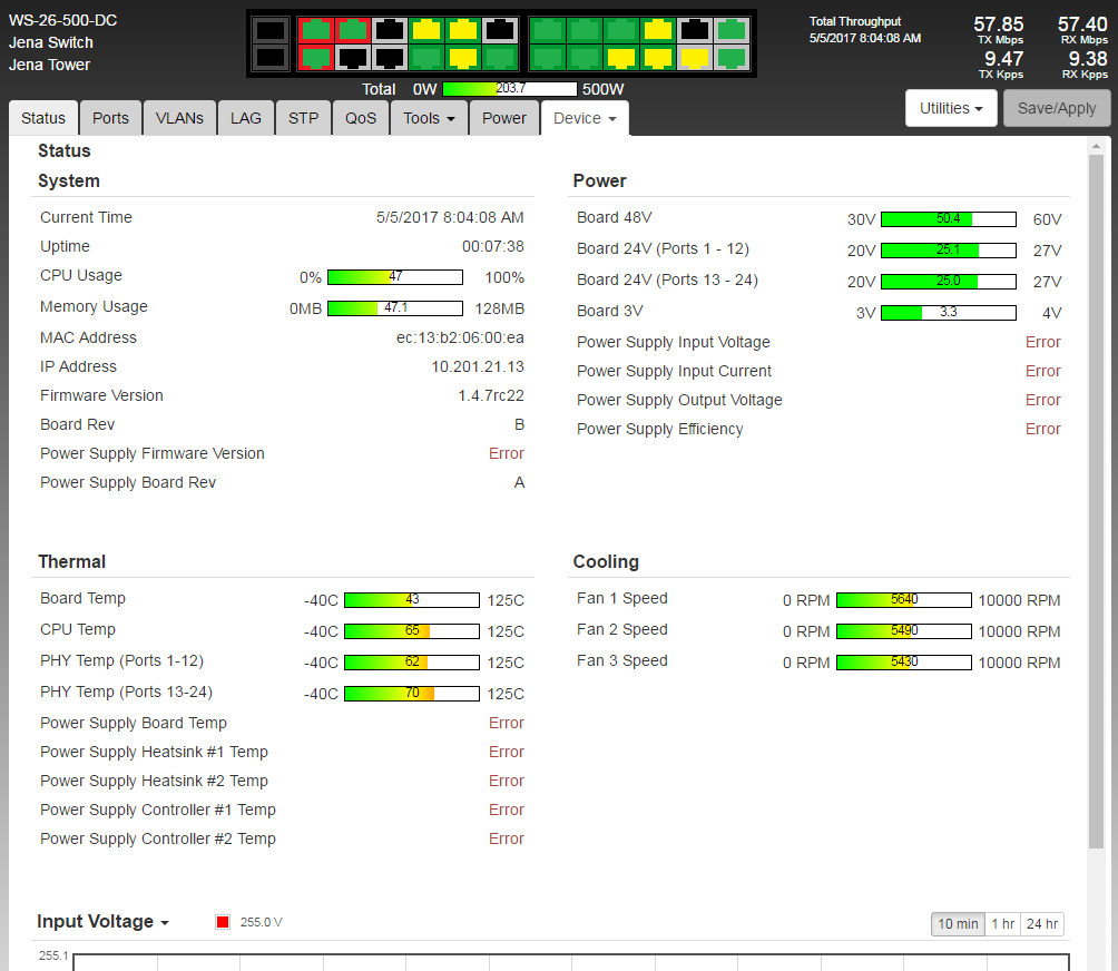 On the WS-26 the upgrade went well, but it appears that the switch rebooted after the upgrade (taking down all connected radios). And now it can't seem to find the power supply. I attached the log, and a screenshot of the status page. CPU usage appears lower now, however it is still higher than a similarly configured WS-12.