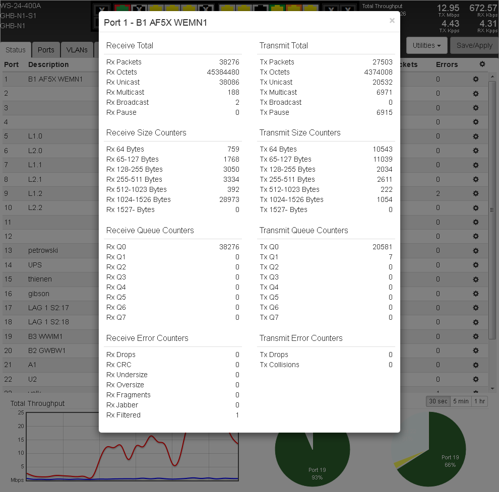 Thinking about a question IntL-Daniel had asked at the UBNT forum on this topic, I did a "clear counters" and created this screenshot after some seconds. Note there are 6915 pause frames sent for 38276 packets received. I've even seen the TX FC counter to go up while the traffic was as low as 1-2 Mbps as seen on the left half of the total throughput graph.