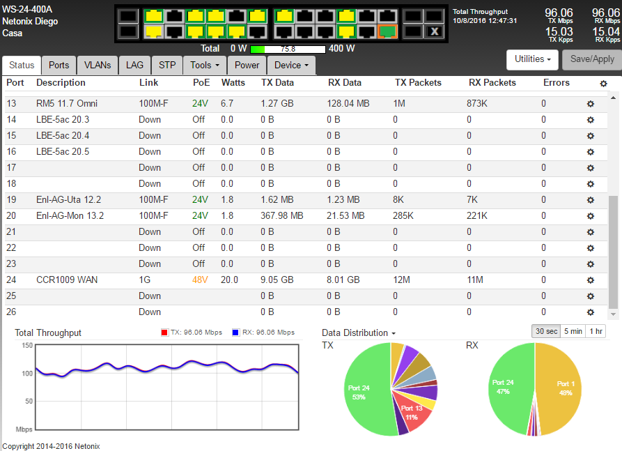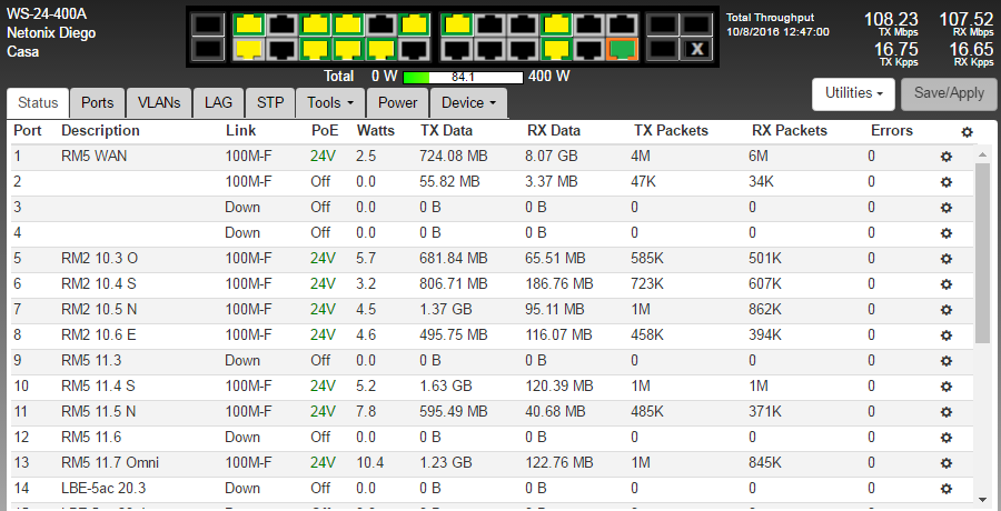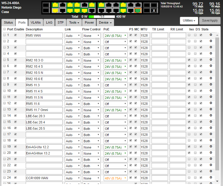 * 2 hot I disconnect devices are in port 19 and 20 (UBNT AirGrid Firm.v5.6.6 M5 HP xw), 3-5 seconds and then everything starts and traffic normally.