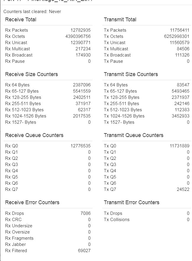 There are no CRC or any errors on the ports to indicate a problem on the links to indicate a reason for packet loss.