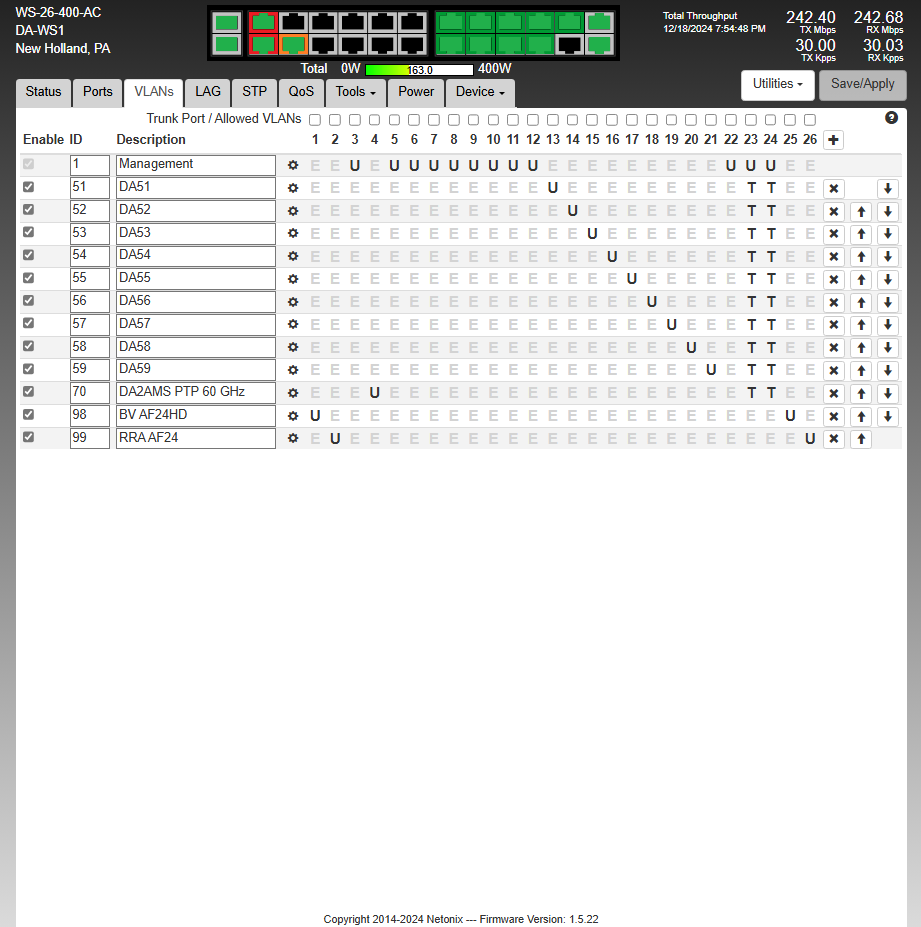 Notice Port 1 is bonded (VLAN) to Port 25 - Bandwidth IN