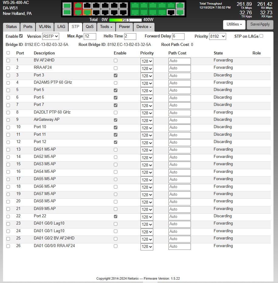 Port 2 and Port 26 are in a private untagged VLAN, again see screen shoots. (Backhaul to next tower in loop)
