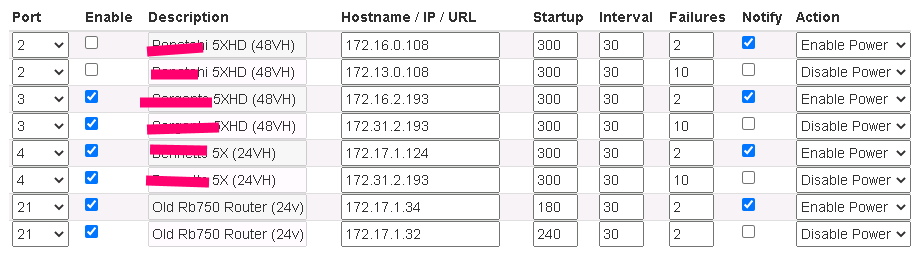 There's a wee bug I come across from time to time in the Watchdog feature. It sometimes keeps ports powered up and only disables the LAN. Ones shown with blue arrows are working as expected. One shown with green arrow is exhibiting this "feature" .