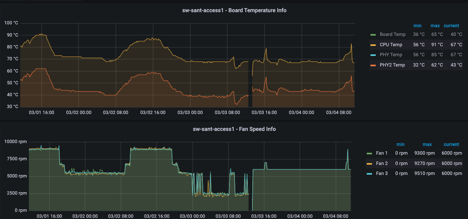 For the two switches that we have past data and new data, they were both running 1.5.0 and 1.5.2. Now I'm not sure whether firmware changes up to now has specifically made changes to how the fans work, but this pattern doesn't seem quite right. Constant thermal expansions on those CPUs will not be good in the long run
