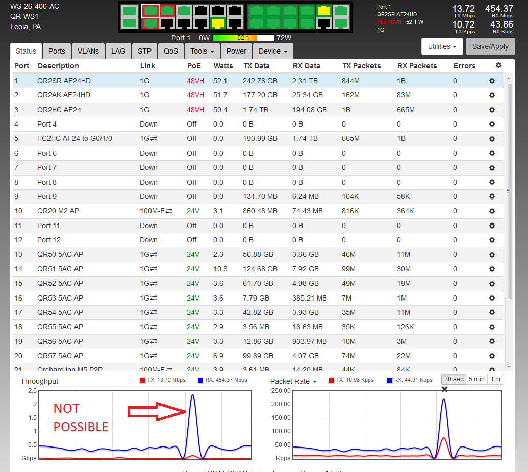 To make a long story short its all about timing. We tell the switch to take readings every second or so it's supposed to. But graphing is a LOW priority service and sometimes the switch gets busy with higher priority stuff like STP, LACP, and so on delaying the readings. When the reading gets reported we just assumed 1 second since last reading but if delayed say 3 seconds then it averages out the reading based on 1 second. This anomaly shows up in all graphs as seen in picture below.