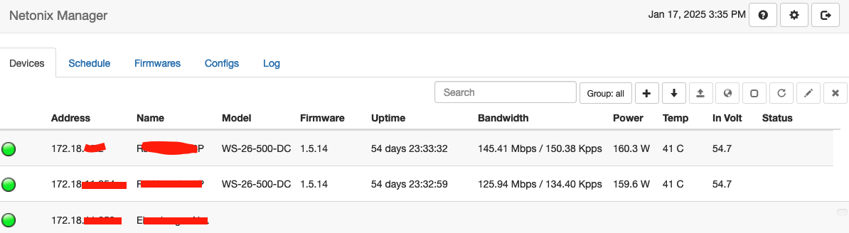 To add switches I used 172.18.0.0/24 wild card discovery and this found close to 80+ switches , We noticed there were duplicate entries as manager found monitor IP's on these switches as separate device. All switches were shown for a while and then the page refreshed and Only 3 netonix stayed visible. the last one with incomplete information.