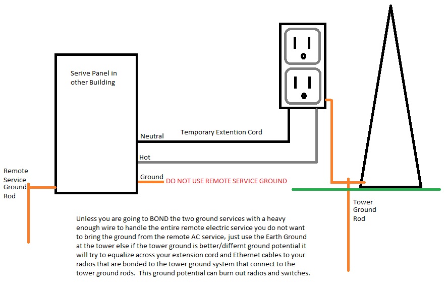 Service Grounds and Tower Ground must be bonded or do not use the Service ground if pulling power in such a way from another distant location.