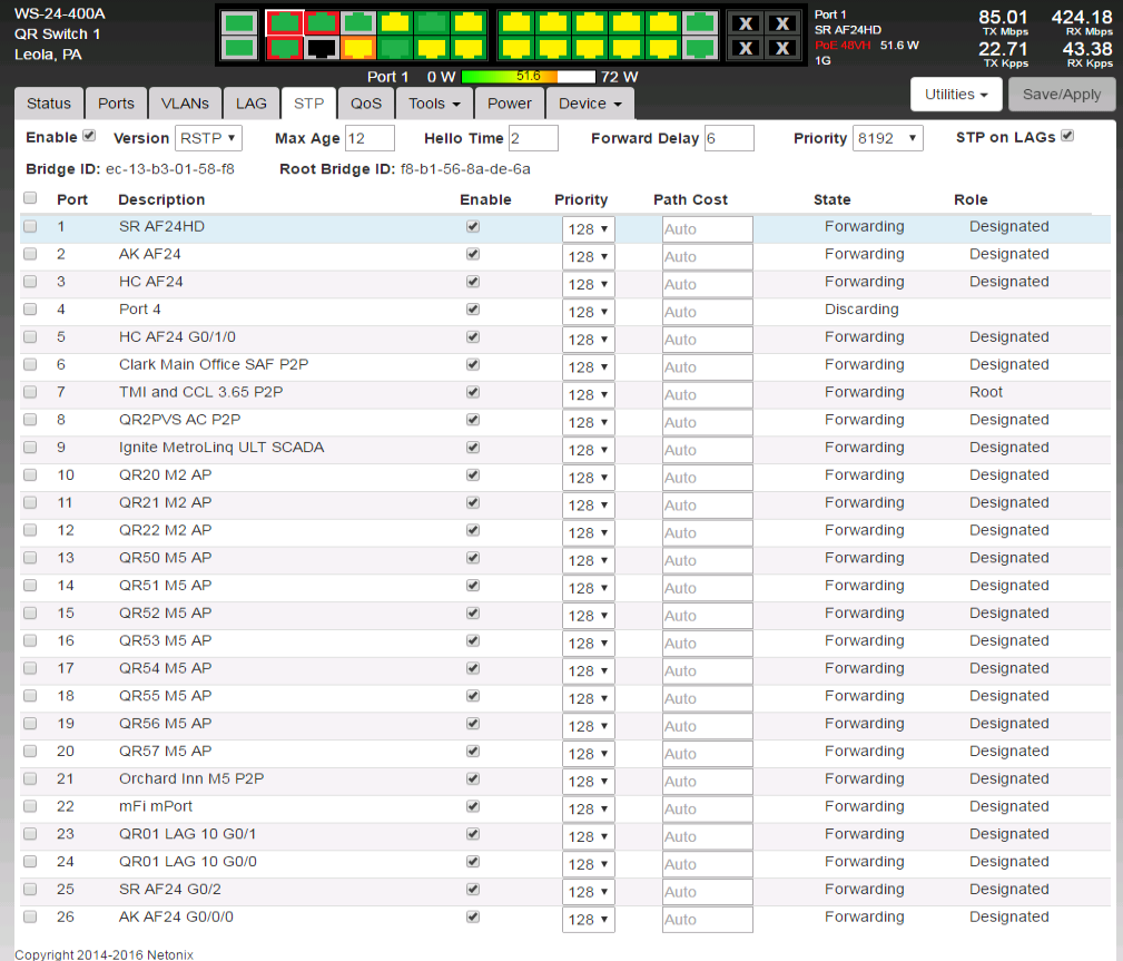 Also, I've seen learning states happen on a port which were caused by link states changing on other ports, even at remote sites, which is a PITA. Again, this is not Netonix specific, but some other switches have more RSTP port configuration options to mitigate such effects. We have modified the UBNT Airmax ebtables rules to not pass RSTP packets between sites if they are in different STP domains. I.e., if you can, split your switched networks into smaller STP domains and prevent any STP communication between them.