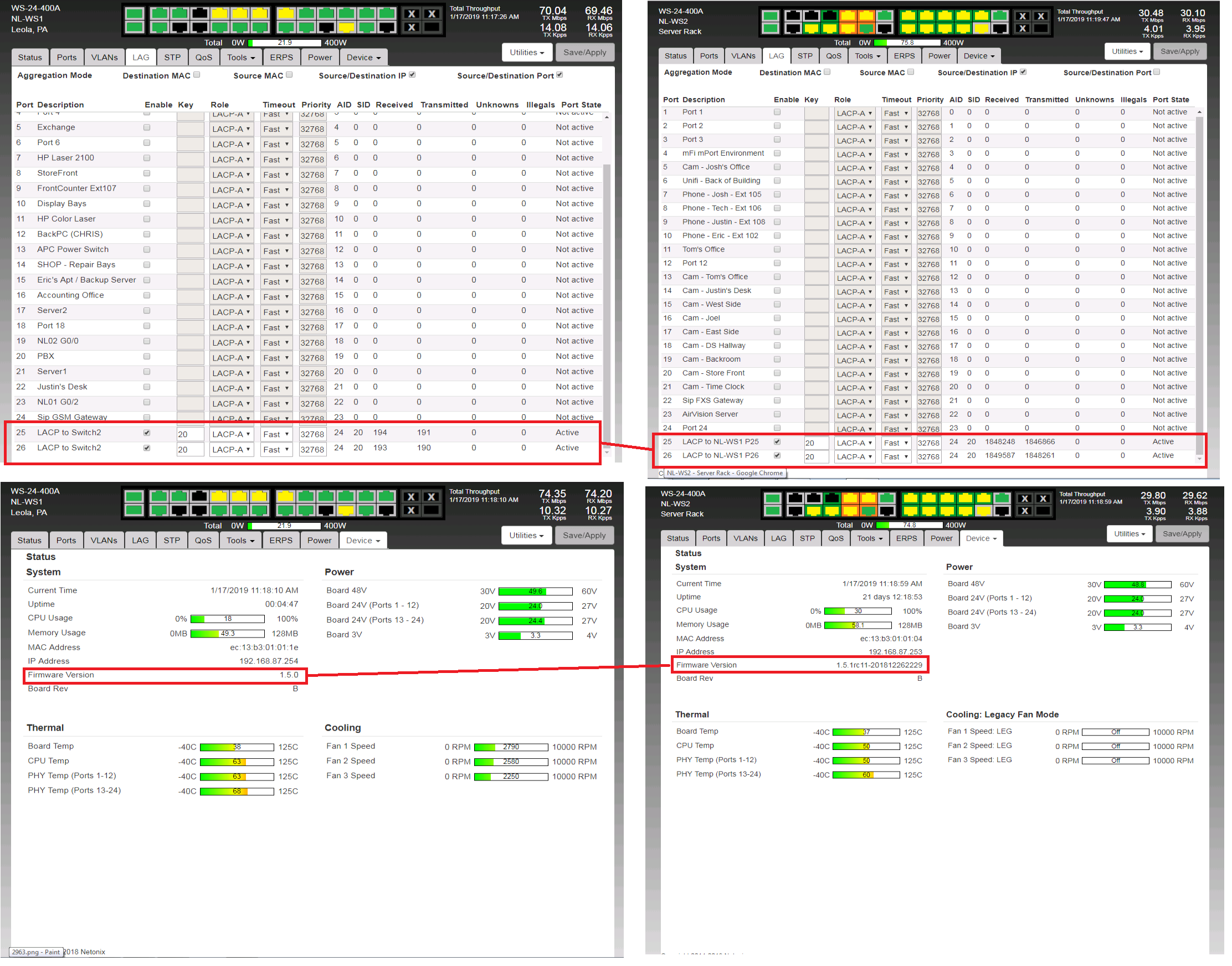Now today I downgraded NL-WS1 to v1.5.0 and the LACP failed to come up. I then rebooted the switch and it came up. Which was ODD I give you that. I think it was more the fact that the SFP modules I have in these switches act weird from time to time?