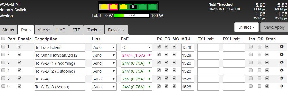 On port 5 & 6 we have two other routers (Mikrotik radio's) connected.
