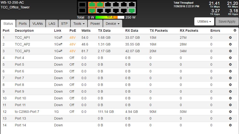 Hello, I have a WS-12-250-AC with three Ubiquiti M5-Ti Rockets attached. The switch is reporting around 200 W being used. I've updated the firmware on the switch to 1.4.2 and the Rockets have updated firmware as well. Ideas? The rockets report to be using 53.4, 49.9, and 81.4 Watts. I doubt that is actual.
