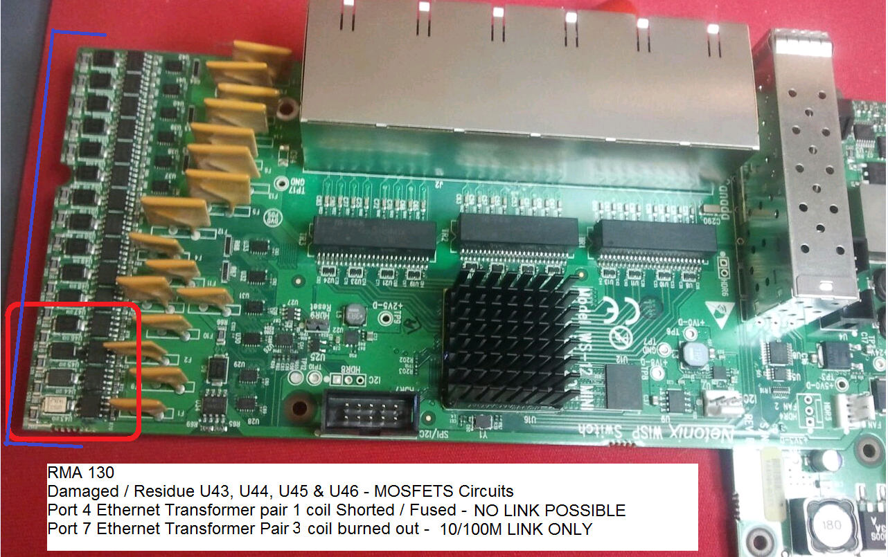 Typical reason for this is either a surge which exposed the current sensors to a voltage greater than 80V or ground potential shift/differential between your tower and your equipment box. Ground potential shift is the most common reason. Make sure tower ground is bonded to service ground. Have a dedicated ground run to all equipment that is less resistive and shorter path to ground than your Ethernet cables.