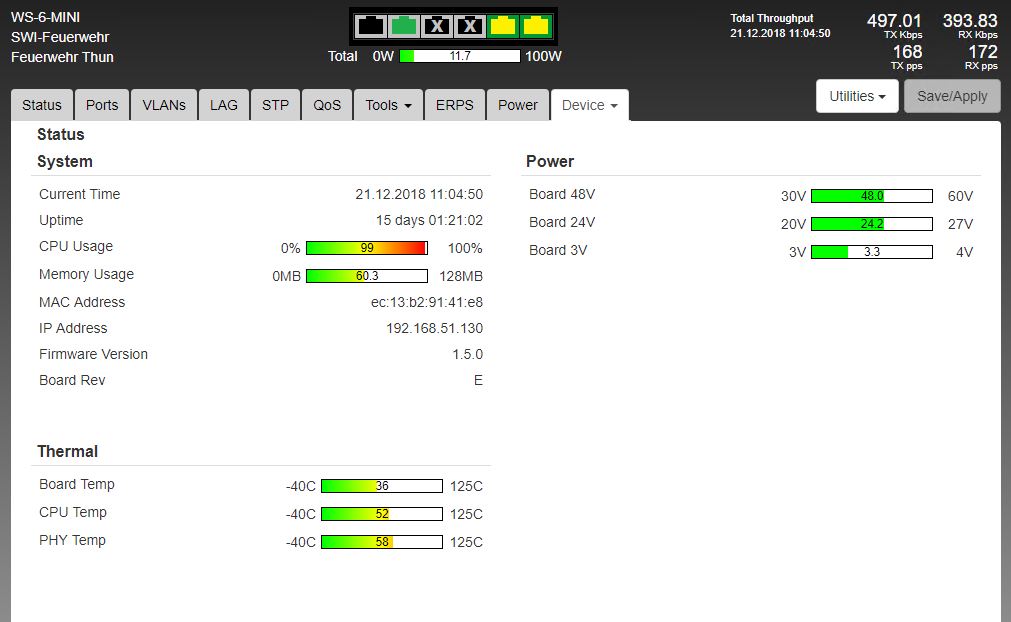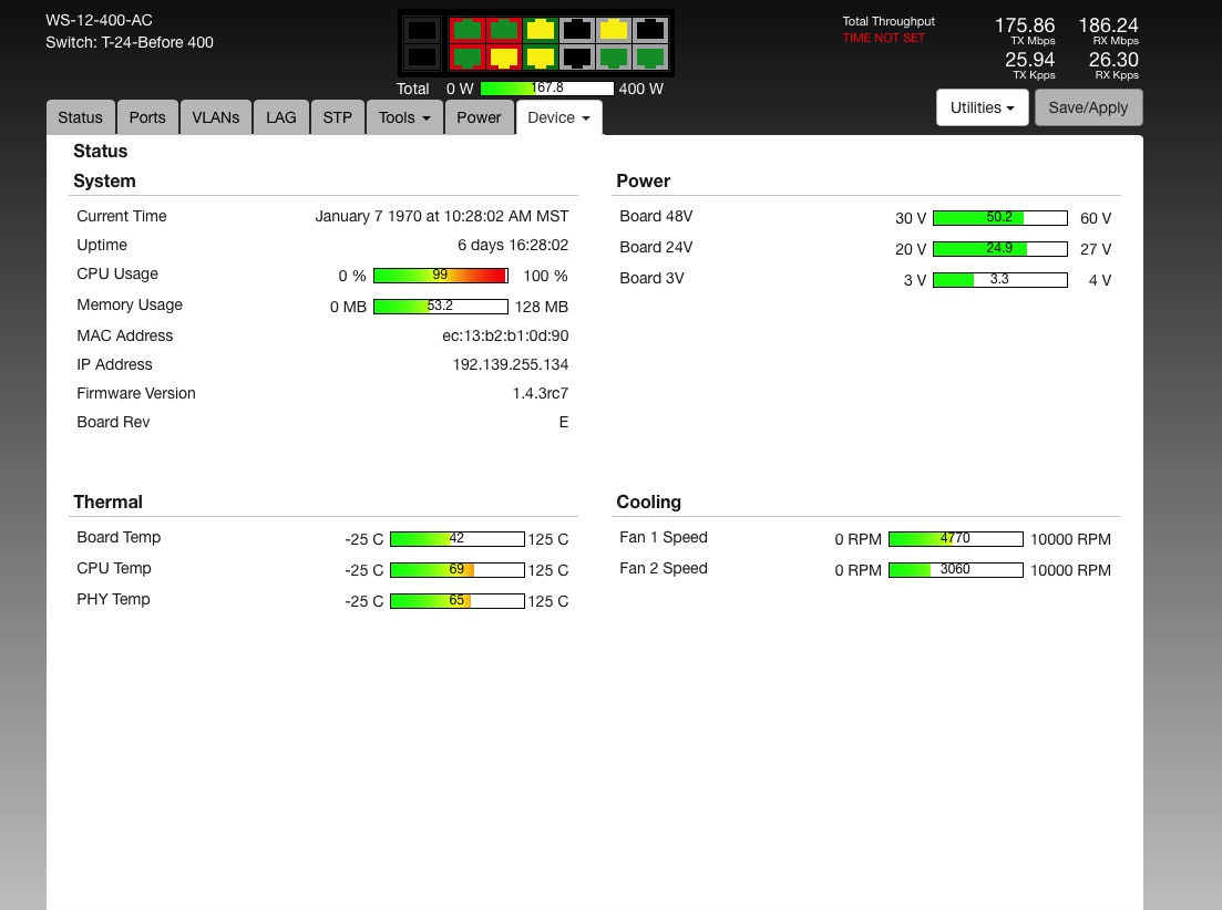 Hear is a screen capture of the unit in question. As far as that segment network, it connects to our core router and handles the distribution there. We replaced the WS-12-250A with the WS-12-400 last week and still the problem is there. We are replacing it with the WS-24-400 today or tomorrow as we need more ports anyway. Thanks so much for looking at this for us...