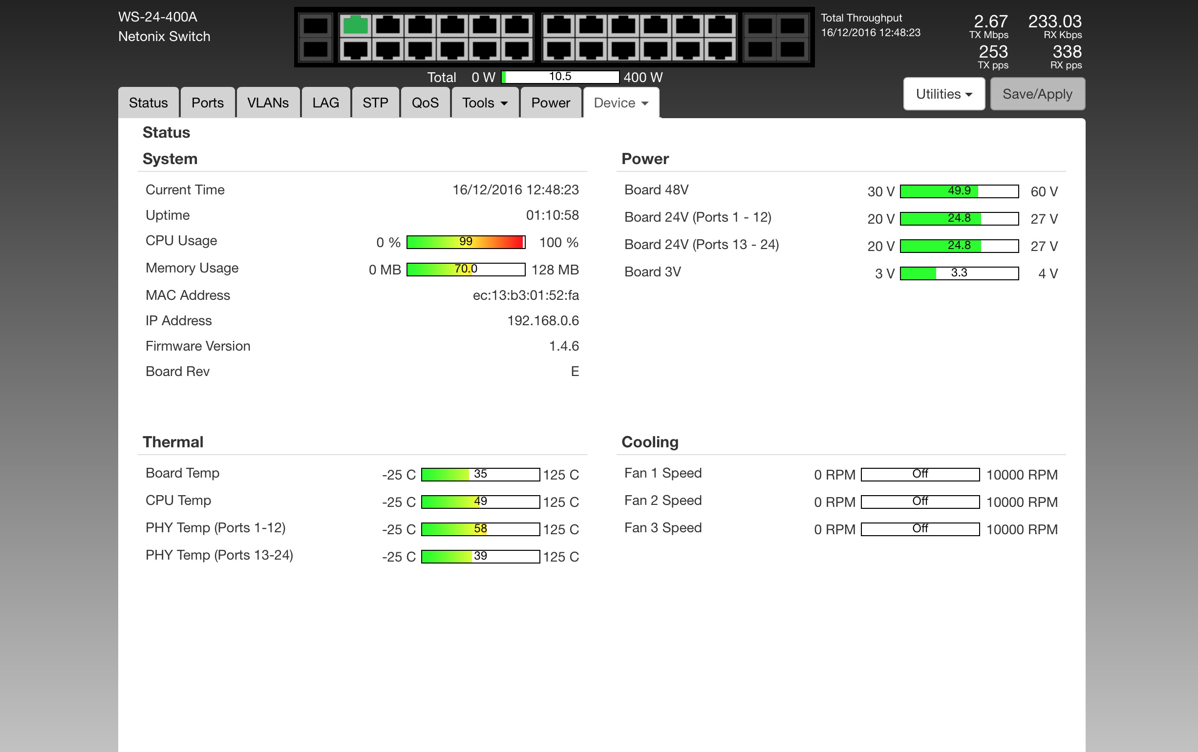 Also the Total Throughput stats were reporting nearly 1Gbps of data through the switch - checking the devices connected to it they were all reporting 40-50Mbps.