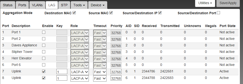 Before this switch was setup with just a single uplink to the Elm Router, but in an effort to distribute the pause frames between ports I setup this LACP a few months back.