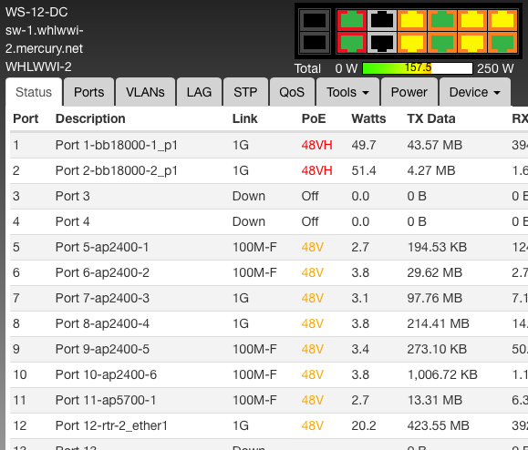 Attached is a screenshot that shows the system under normal operation. Total power used is under 160 watts. But on a cold reboot, Ports 4 through 11 have ePMP APs on them use much more power as the heater runs at power-on.