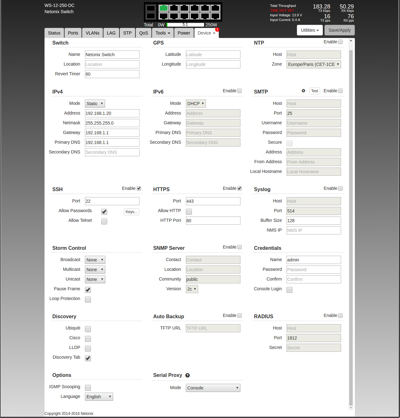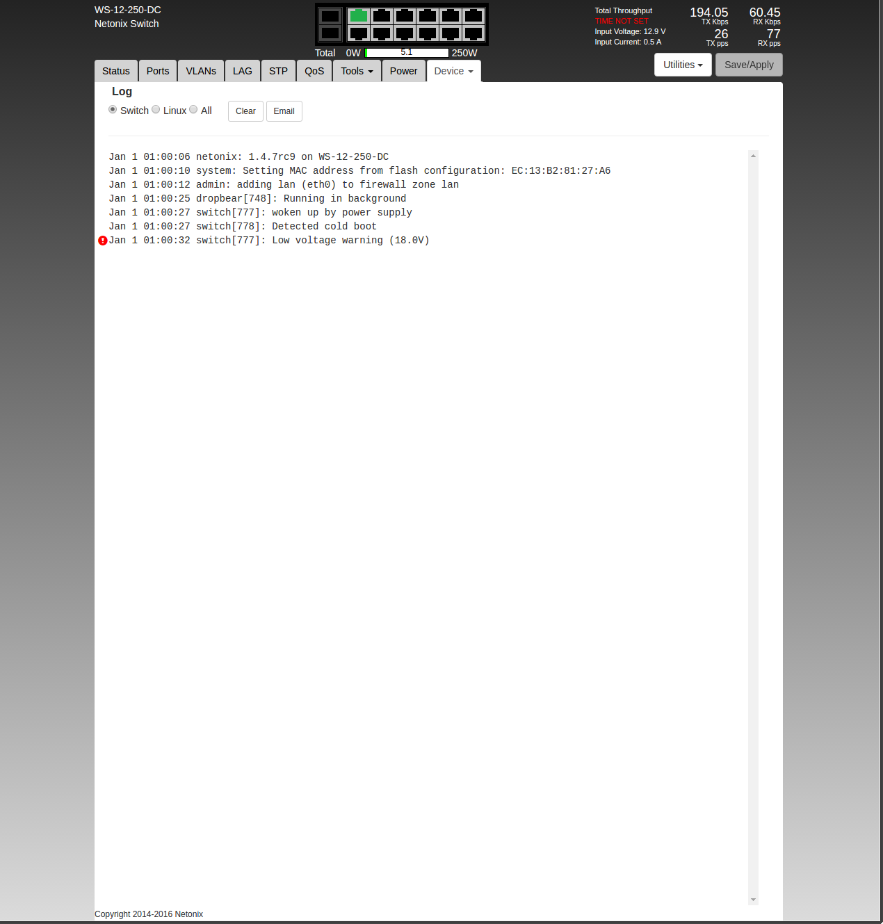 I attached some screenshots of the tabs of the netonix. (The warning in the log is due to the warning voltage)