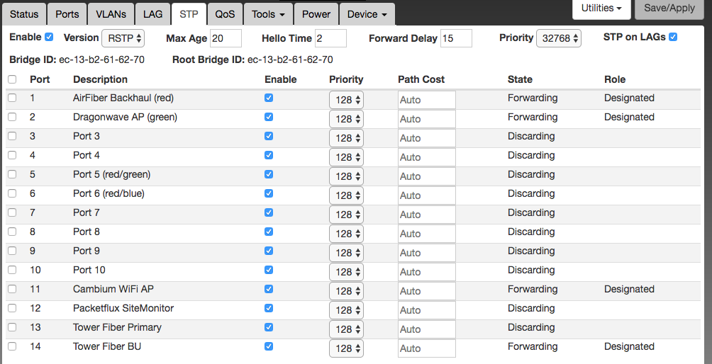 About 12 hours after putting the LACP into action, we lost the switch when we powered down a POE port at the top of the tower. That same POE port had been designated ROOT even though it was attached to an AP serving customers. None of the customers below it can have DHCP traffic coming upstream - or radios do not allow that.