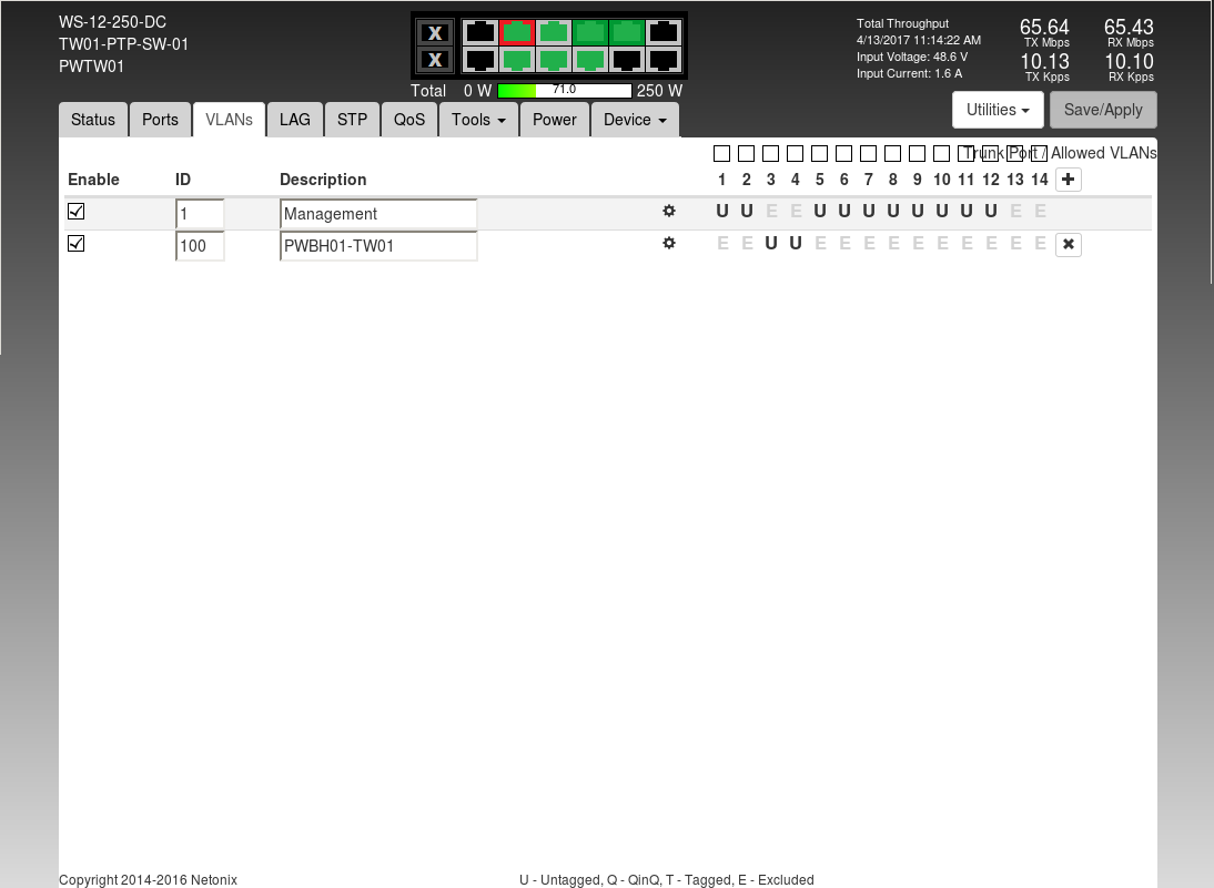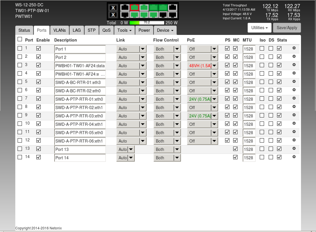 However, when a radio needs either 24VH or 48VH then the physical connection is ERX -> Netonix -> Radio data/poe port. And in this case the Netonix ports have a dedicated vlan for the PTP link.