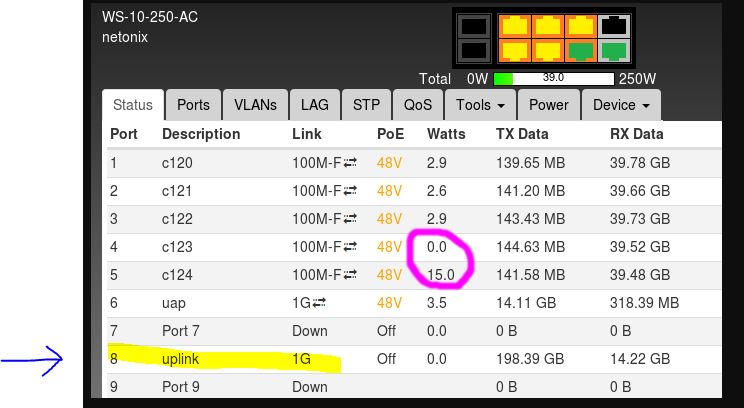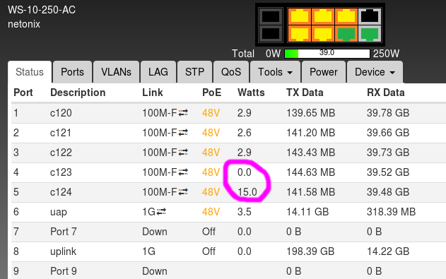 I got five identical cameras that always showed similar power consumption. Lately, I noticed two of them are way off. The cameras work fine so I'm not sure if this is just an instrumentation error or the two ports are failing.