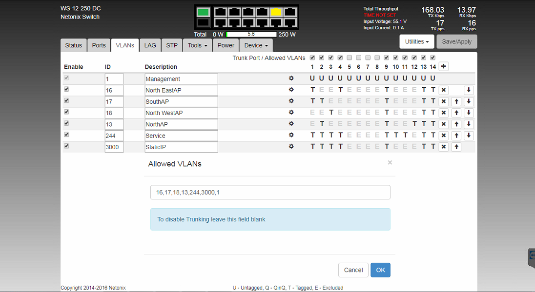 We need it set up to accept vlans 13,16,17,18,244,3000 on various ports