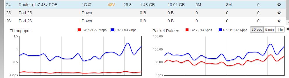 Hmm I get the 2x throughput deal, that's not the case here. I can click on the port that uplinks to our router and get this: