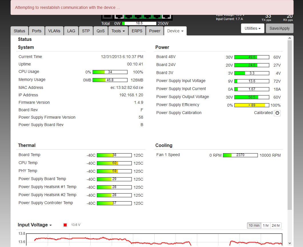 So we replaced the unit with another and took this back to the lab to test. Upon powering on the unit we reset it to factory and everything seemed normal. In order to further test functionality we added 3 devices totaling to 20watt consumption. After 10 minutes of operation the switch did the noises again 2-3 times and turned off. It then refused to power on until we waited about 10minutes to try again but this time it turned off after a minute of operation (attached screenshot at the state it turned off)