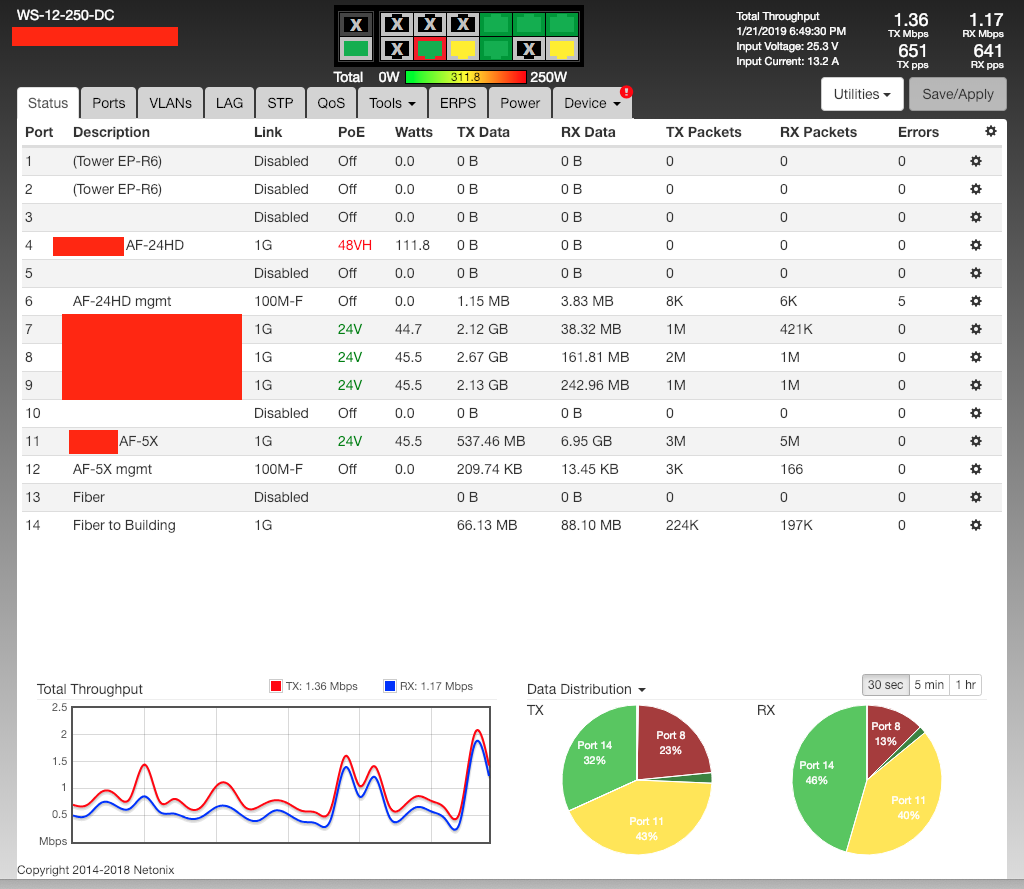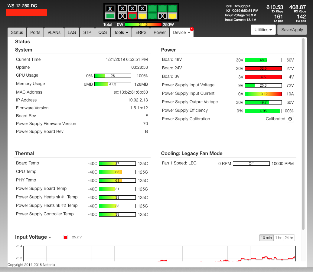 I'm guessing this must be a damaged switch but wanted to ask anyway. I have a WS-12-250-DC running 1.5.1rc11 earlier today and now 1.5.1rc12 later today. There was a lightning storm in our area of California that blew out PG&E power on the hilltop yesterday afternoon and led to running my two Optima Blue Top D31M batteries down to 11.18V each before it was restored. When I was able to restore remote access to the WS-12-250-DC this afternoon, it shows power values way out of normal range. The switch showed 24.7 V input and 14 A earlier with an AF-24HD (which is also acting strange), three Rocket 5AC, and an AF-5X powered by the switch. I measured the power draw with a meter and it showed three amps max at about 24.7 V. The values in the screenshots are way off. Any ideas?