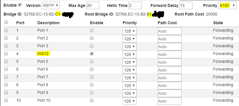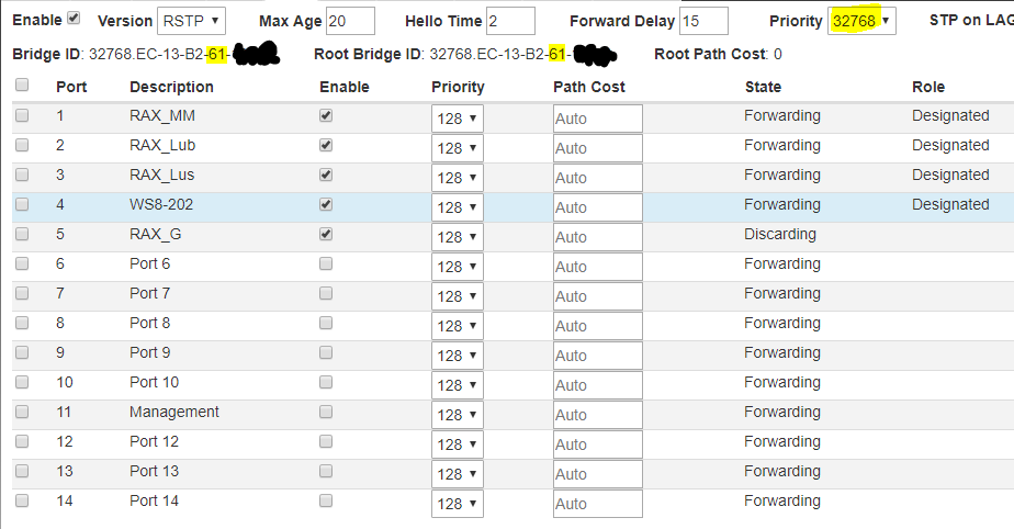 Even other brand priority is not respected. I tryed a setup with 3 Raisecom RAX711 and the STP priority of those device is also not respected by the netonix. RAX no 1 have a priority of 28672 and the 2 other RAX elect it as root switch but the WS12 with priority of 32768 elect itself as root switch since it own mac address is lower, completely ignoring the RAX priority.