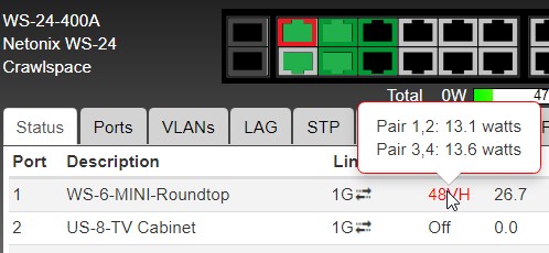 I was testing a new Ideal crimper on a cable I strung between two MINIs and I wanted to make sure the crimp was making a good connection so that current draw was equal across all pairs. When I mouse over the port, it shows 0.0 on all pairs. The other ports doing 24V show which pairs and the watts. As a sanity check, I tried the same on the WS-24 and it shows the per-port numbers.