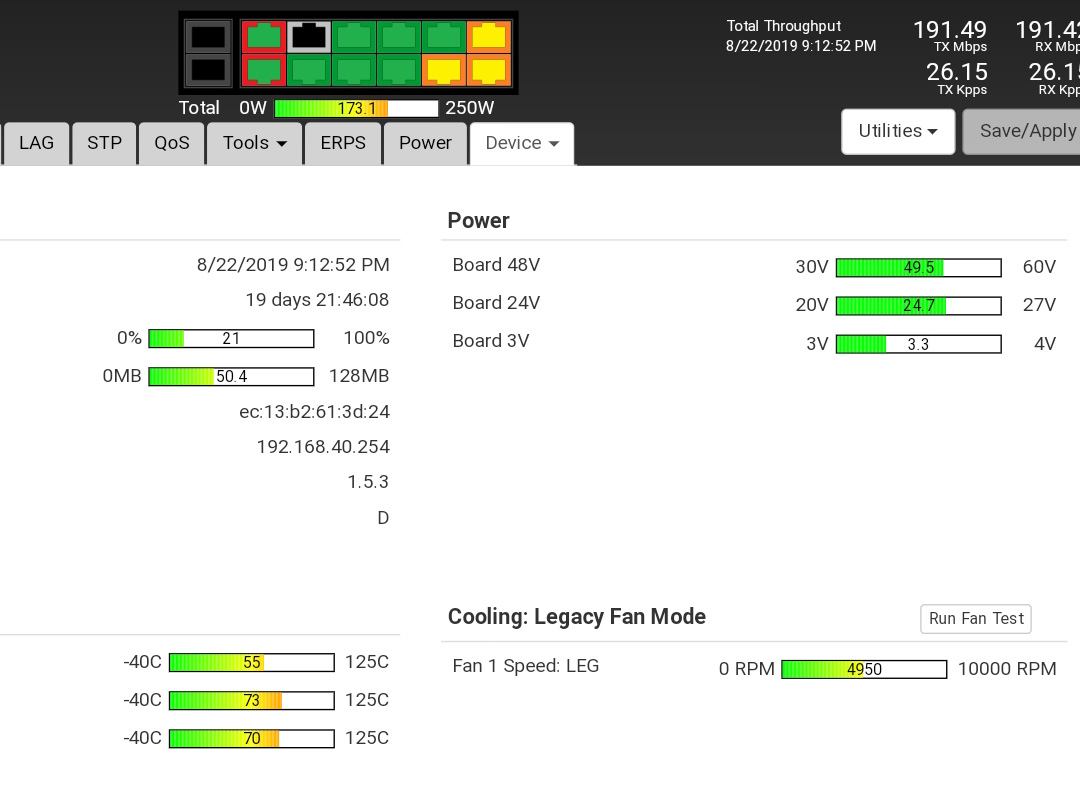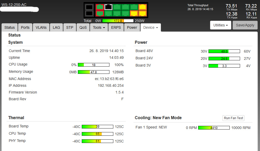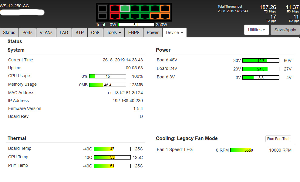 I have WS-12-250-AC for years (rev. D) and sometimes I had unexpected reboot. NETONIX support said it must be probaby hw issue of the switch (probably power supply) and recommended to try different unit there. So I did it and change it to the new one (rev. F). Currently I can see big difference in thermal status of the new one (rev. F) in compare with the old one (rev. D)... especially look at board temperature and uptime:
