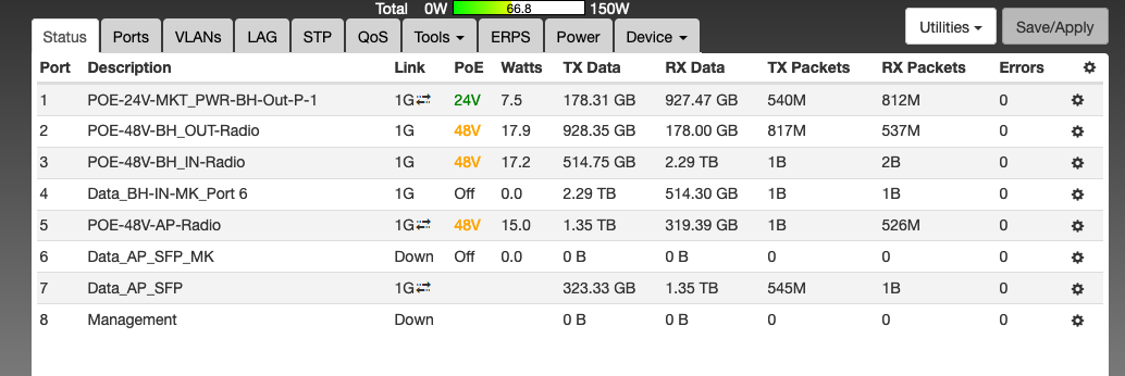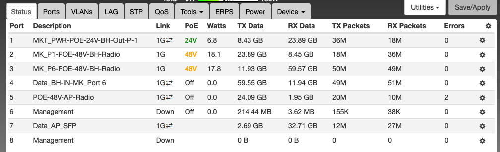 Here are some snips of status (Device) page now (no POE on port 5 for the AP)