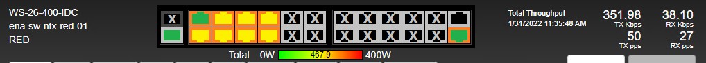 We have twelve WISP WS-26-400-IDC switches running firmware version 1.5.8 running in 12 different locations and we have configured PoE for up to eight ethernet powered cameras but on about half of these switches, the total power usage involved is greater than the wattage of the switch for example one or our switches has 400W total power but when the ethernet cameras are plugged in the total power usage is 464W (64W greater than what the switch can supposably handle), the remainder only use about 70W depending on how many cameras are plugged in via PoE. Each of the first 8 ports is set up as 48V PoE and 0.75A but each port on the overpowered switches is using around 54-55W per camera whereas the other switches which are using around 70W are only using around 5-6W per camera with the exact same PoE and system configuration (apart from the IP addresses to access them)
