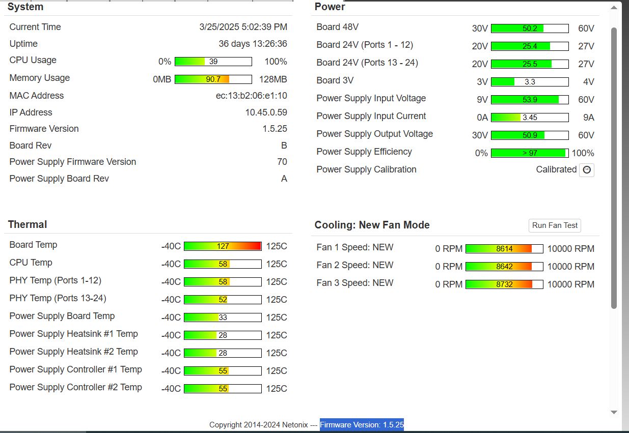 I have a WS-26-500-DC at Firmware Version: 1.5.25 that is reporting the board temp at 127c. I had a tech go by tower site and he said the Netonix is cool to the touch and my other equipment, the router, a CCR2004-16G-2S+ is at 44C cpu temp, the algcom ups is at 117F in this same box aren't reporting high temps. I'm experiencing so packet loss to devices connected to the netonix. I'm not sure if the temp was high before or after upgrading to 1.5.25 about a month ago.